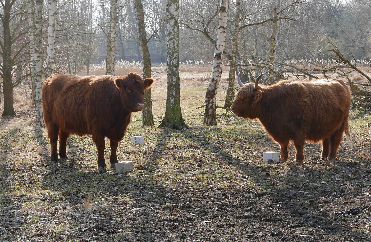 Weiter geht es durch das halboffene Lietzengrabengebiet am Seegraben entlang, der in die Bogenseekette mündet. Die drei tiefergelegenen Waldseen liegen im Schatten und sind noch mit einer dicken Eisschicht überzogen. Am Himmel hört man tatsächlich Kraniche trompeten. Hinter dem Karpfenteich, dem südlichsten See der Kette, hat sich eine Gruppe langhörniger Rindviecher fotogen zwischen den Bäumen drapiert. Der Anblick der massigen Tiere in der tiefstehenden Sonne könnte magisch sein, wäre nicht das Grollen und Rumpeln der Brummis auf der nahegelegenen Autobahn, das jeden Anflug von Wildnisromantik im Keim erstickt.